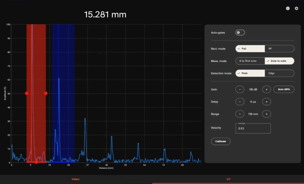 You see the drone approach the surface, position the probe arm, prepare the spot and hold steady contact while ultrasonic readings are captured. During this phase, the operator adjusts UT pulser parameters live in the Scout Companion app to home in on the right echoes and get accurate thickness.